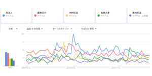INIの11人のメンバーの、2025年10月23日までの過去12カ月間のYouTube検索ボリュームをGoogle Trendsで調べると、ツートップは西洸人と藤牧京介で、僅差で西のほうが多い(図表1)。
