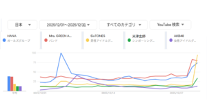 図表1 2025年「紅白歌合戦」出場アーティストのうち12月1~31日のYouTube検索量TOP3と、4~7位のうち大晦日に検索量が増加したアーティスト2組(Googleトレンド)