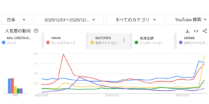 個人的に、今回印象に残ったのは、HANA&ちゃんみな、SixTONES、Number_i、aespa、ミセス、米津玄師、ユーミン、AKB48だった。12月および大晦日のYouTube検索数が多かった紅白出場歌手のグラフも添えておく。